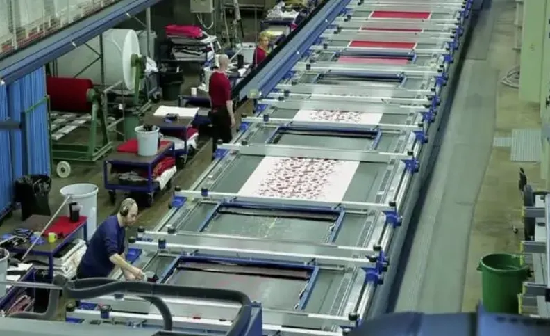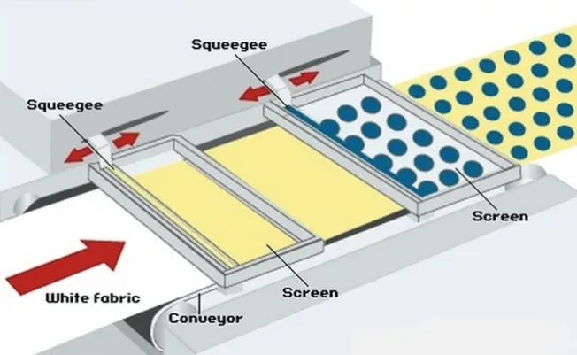 Once under the screens, the fabric stops. The screens are lowered and then the automatic squeegee moves across each screen pushing print paste through the design or open areas through the screens. The screens are raised, the blanket precisely moves the fabric to the next color and the process is repeated. Once each color has been applied the fabric is removed from the blanket. The fabric moves through the required fixation process. The rubber blanket is continuously washed, dried, and rotated back to the fabric infeed area.